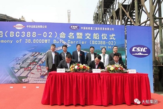 On April 26th, DSIC Shanhaiguan Shipbuilding Company Limited held the naming and delivery ceremony for the second 388,000-ton bulk carrier built for SINOTRANS Shipping LTD after the first ship "Da Mei". Xie Shaohua, the Deputy General Manager of SINOTRANS Shipping LTD, Cai Zhuyi, the Deputy General Manager of China Shipbuilding & Offshore International Company Limited, Qiu Zhijian, the Deputy General Manager of Qinhuangdao Branch of China Classification Society, and Yao Hongshan, the Member of Party Committee of DSIC and General Manager of Shanhaiguan Shipbuilding Company Limited attended the ceremony. Ms. Huang Meng, a guest, named the ship “Da Li”.