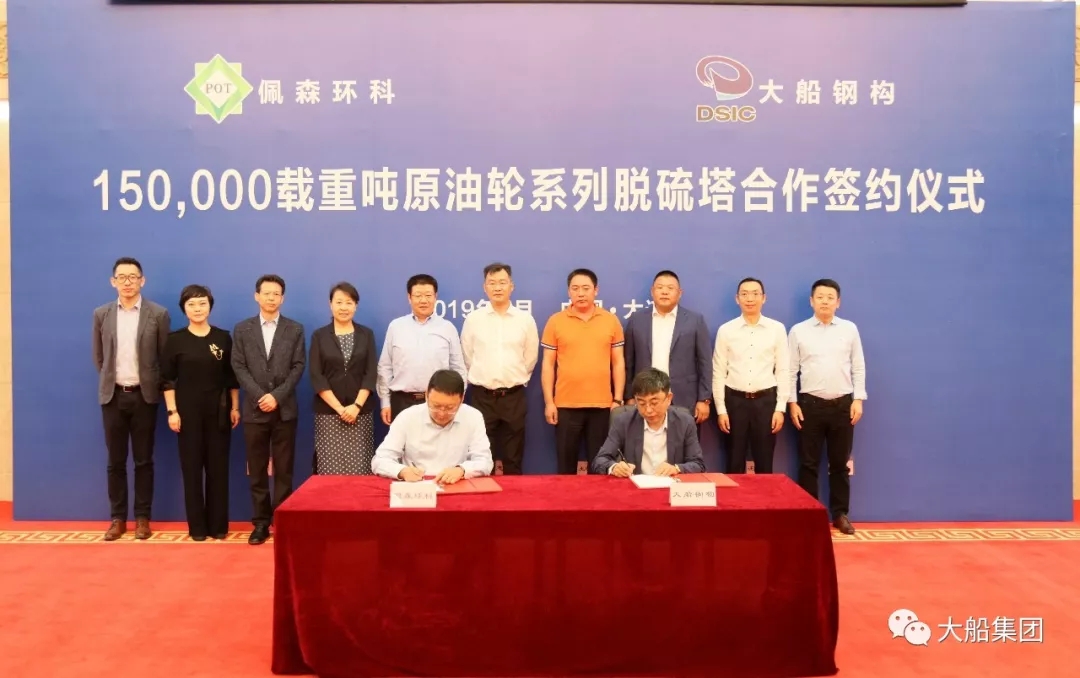 9月29日,大船集团钢构公司与鑫弘重工佩森环科签署了15万吨原油轮脱硫塔项目合作协议。同日,大船集团钢构公司为新加坡太平船务公司建造的首台套3600TEU集装箱船脱硫塔建成暨2号塔开工仪式成功举行。鑫发控股总裁王晓军,鑫弘重工董事长徐东进,大船集团领导杨志忠、邓昌连以及相关部门负责人参加仪式。